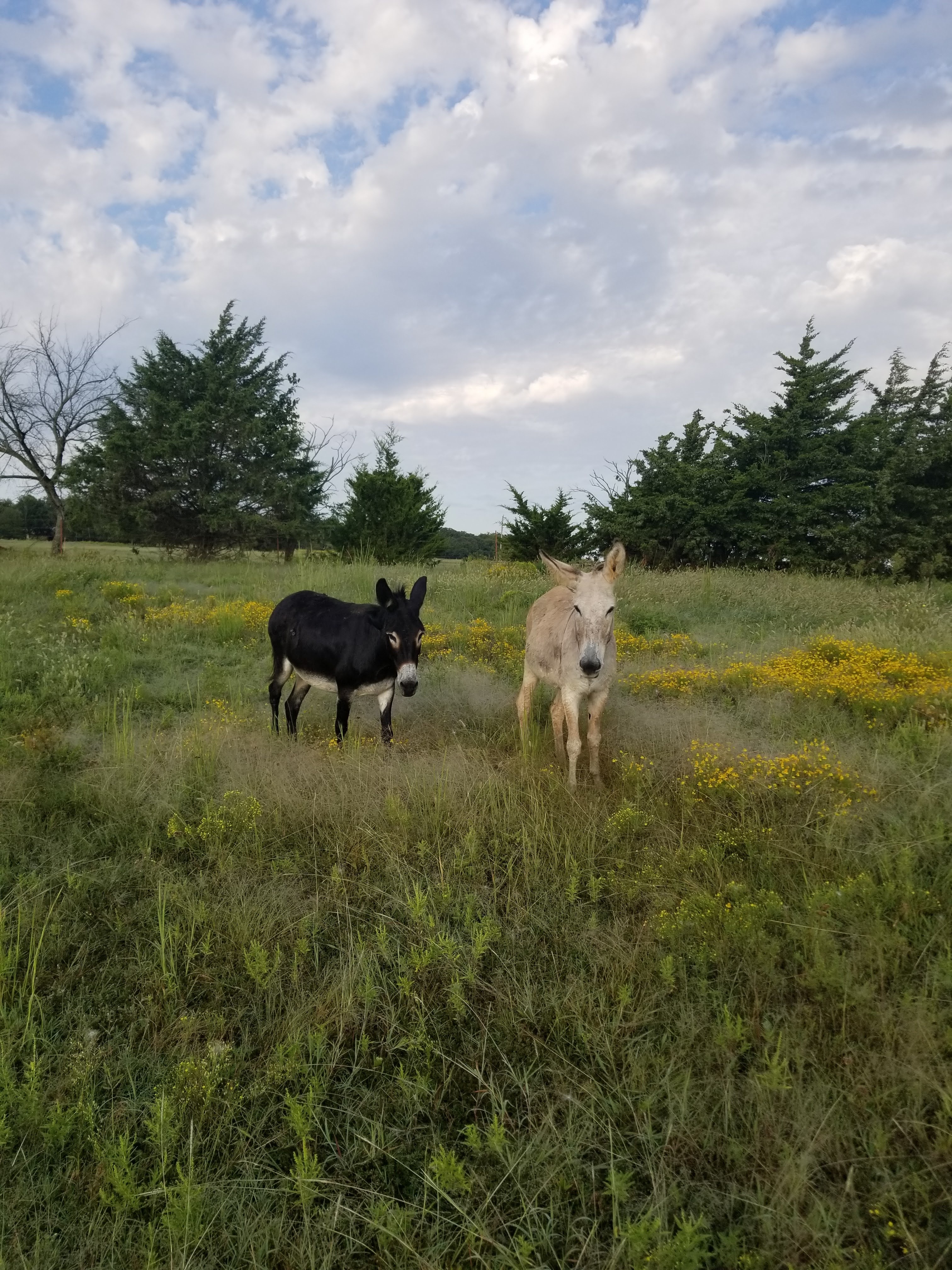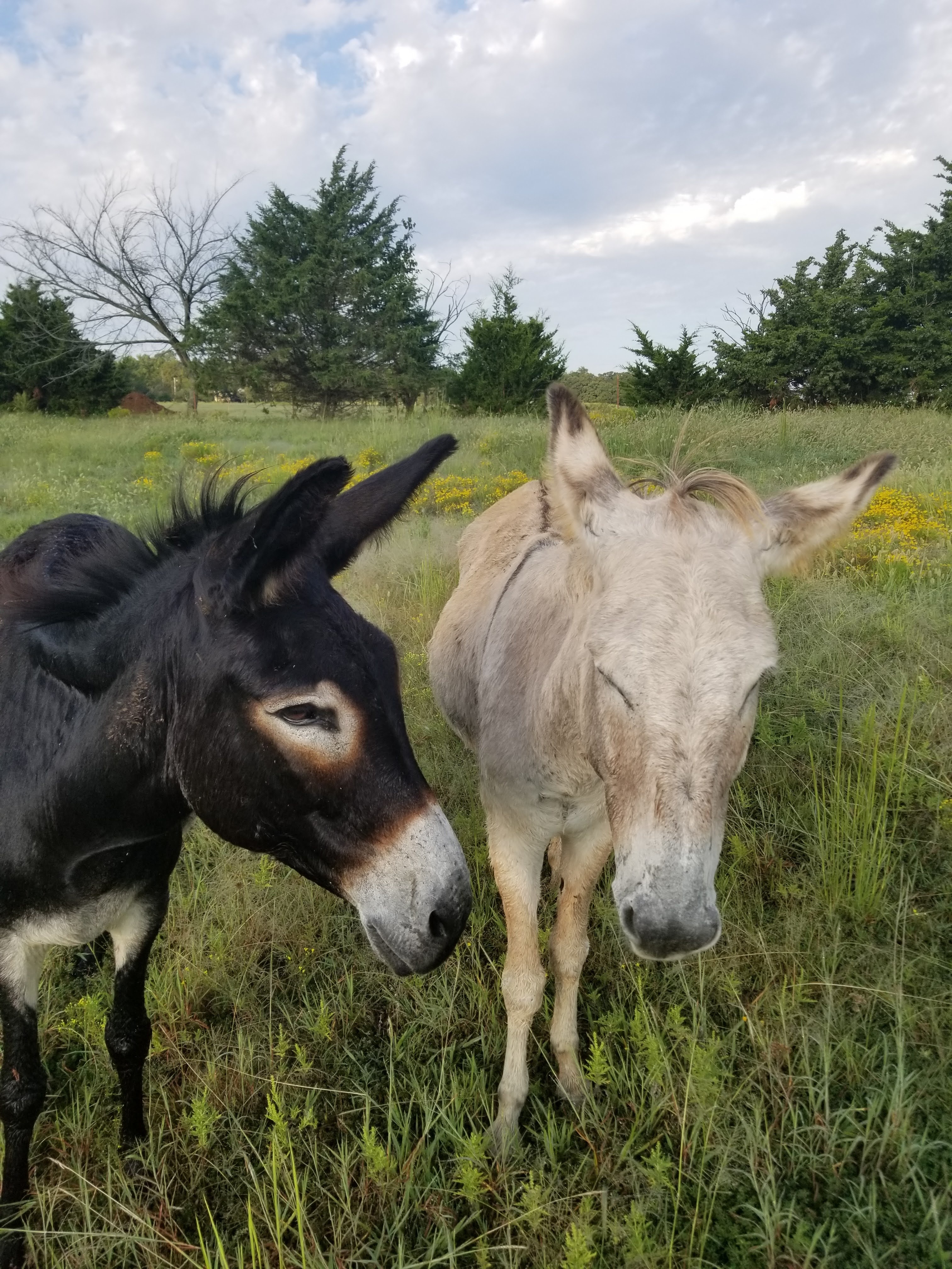 We have a donkey, Ellie (the black donkey), that we got from Peaceful Valley Donkey Rescue to protect our property from coyotes. She is a very good girl and is very friendly. We had goats, but she was lonely and we decided to get her a buddy. I looked around for a while and found Daisy (the white donkey), on Facebook. We went to pick her up on a weeknight and got home around midnight. We decided to drive the truck into the pasture, open the trailer doors, and let her come out on her own. Then we went straight to bed. Admittedly, this was not the wisest plan, but it worked out. We got up in the morning and went straight up to the pasture to move the truck out, put the trailer away and check on the donkeys. They had found each other during the night and were SOOOO happy to know each other.